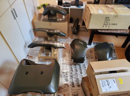 納車待ちで手持ちぶさたな今、フロントカウル、フロントフェンダ、サイドカウル2枚、テールカウル2枚、サイレンサーカバーをスプレーで国防色に塗装する事に致しました。まずは塗装済みのカウル表面を#600番の耐水ペーパーで荒らします。いわゆる「足付け」と云われる作業。表面を荒らす事で塗料がよく密着するようにするのです。本来であれば完全に塗装を剥離し、プライマリ・サフェーサー(下地剤)をスプレーした上に色を乗せるのですが、今回は艶消しの国防色で、どちらかというとミリタリーライクでラフな出来上がりを狙う事もあって、足付けからの作業としました。