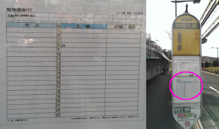 我が程久保基地は、多摩都市モノレールの程久保駅と多摩動物公園駅のちょうど中間に位置していて、どちらの駅へも300mの距離。多摩動物公園には、モノレールだけではなく京王動物園線も乗り入れています。八王子や新宿に出掛ける際は、京王動物園線で高幡不動駅に出て、京王線に乗り換えればすぐですし、立川や多摩センターに出掛ける際は、モノレールが便利。勿論、モノレールで高幡不動に出て京王線に乗り換える事も可能ですけれども、乗り継ぎ料金が割高なのと、高幡不動駅構内の移動距離が長いので、高幡不動から先も京王線を利用する場合は、はじめから京王動物園線を使った方が安くて便利なのであります。 このように、東京都内とは思えない程の田舎である癖に、我が程久保基地は、中々交通至便な立地なのでありました。駅が近い為、普段バスは全く使いません。バスターミナルは鉄道の主要駅に設置されており、多摩センター駅、高幡不動駅、立川駅、聖蹟桜ヶ丘駅、八王子駅、日野駅までは電車で移動して、そこからバスに乗り換える方式であります。バスは、鉄道やモノレールが網羅していないエリアを補完する形で運行されています。いわば電車が主要な血管、バスが毛細血管を担当している感じとでも申しましょうか。 先日、モノレール下の道を犬のこむぎと散歩しておりますと、程久保基地にほど近い中程久保に、京王バスのバス停があるのを発見しました。はて。モノレール下の道路を路線バスが走っている所など一度も見た事がありません。バス停には、【高11系】高幡不動駅発、多摩動物公園駅行、と書かれています。あれれ、やっぱり多摩都市モノレールと京王動物園線の両方と思いっきり被っているではありませんか。しかも!時刻表を見ると、何と!!、週に1本しかバスがありません。何じゃこりゃ!!? 週に1便だけ、土曜日の朝8時26分にバスが通るだけのバス停。しかもその路線は、多摩都市モノレールとも京王動物園線とも被っています。路線距離はたったの2Km弱で運行時間は7分間。おそらく路線許可の維持の為だけに運行されているのだと思われますが、何とも不思議なバス路線であります。今度、話のタネに乗ってみようかなぁ。