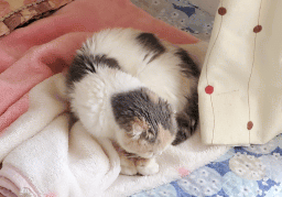 | お気に入りの毛布でくつろぐ、猫のゆず |